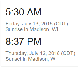 July 12, 2018 greeneyedguide sunrise sunset in Wisconsin Share this: Click to share on X (Opens in new window) X Click to share on Facebook (Opens in new window) Facebook Like Loading...